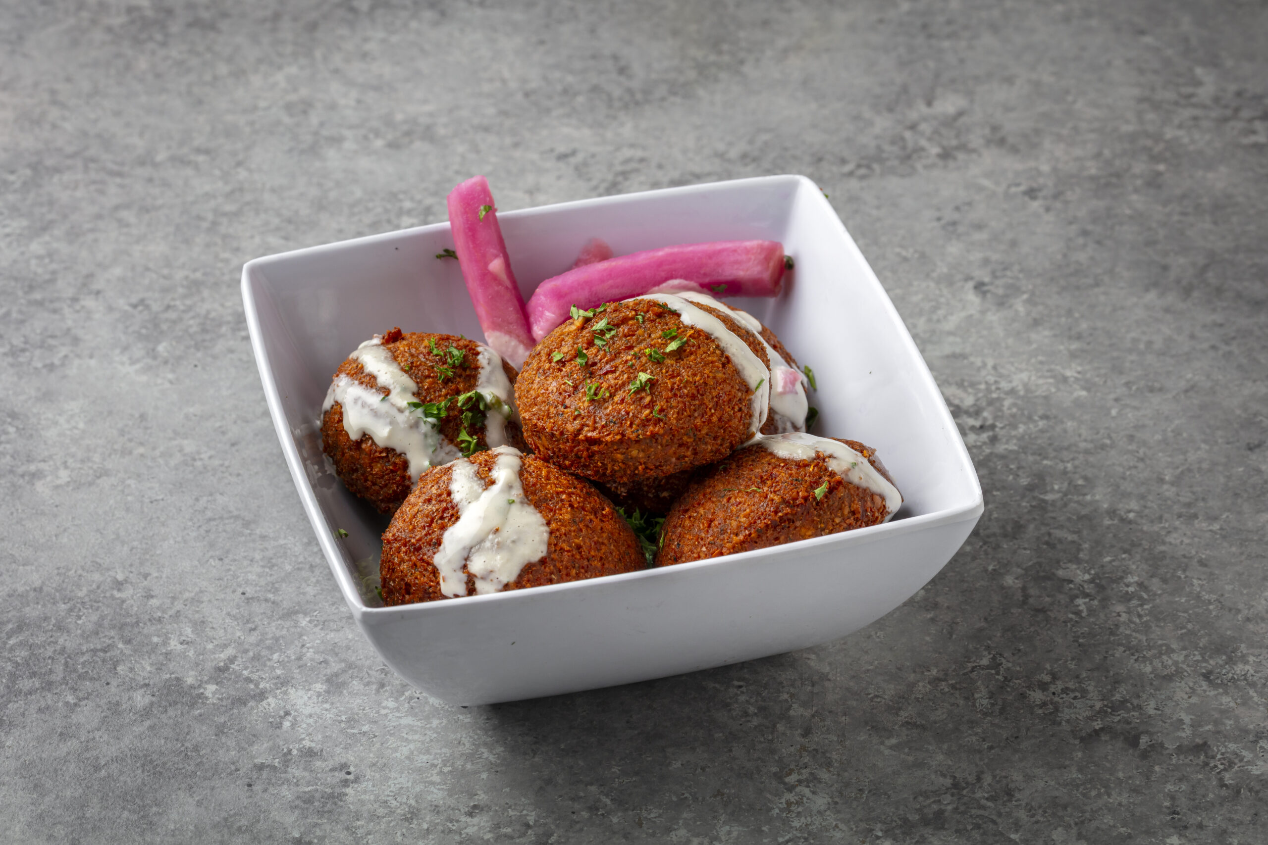 Seven falafels with sides of hummus, green salad, and pickled turnips, served with tahini sauce and pita bread.