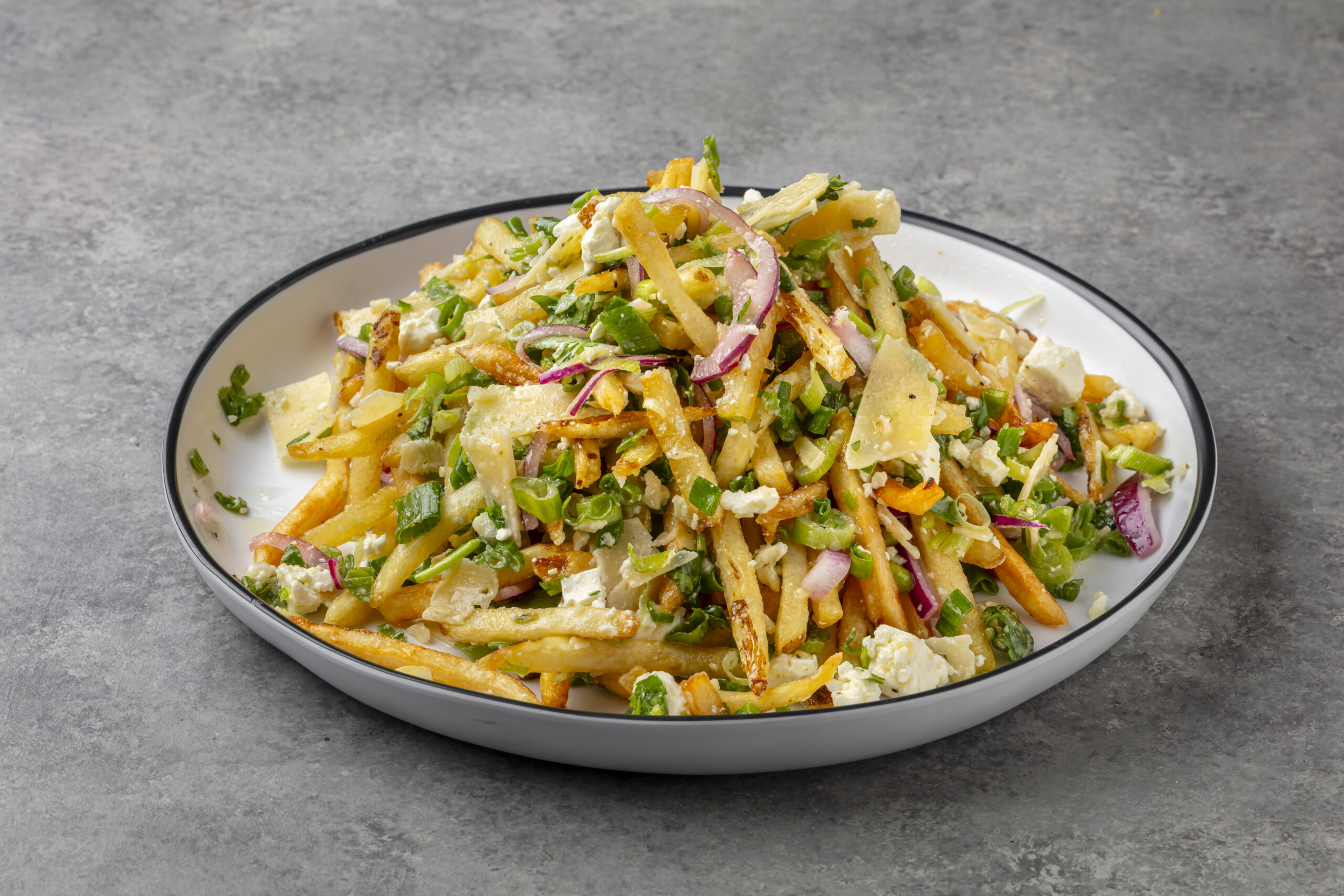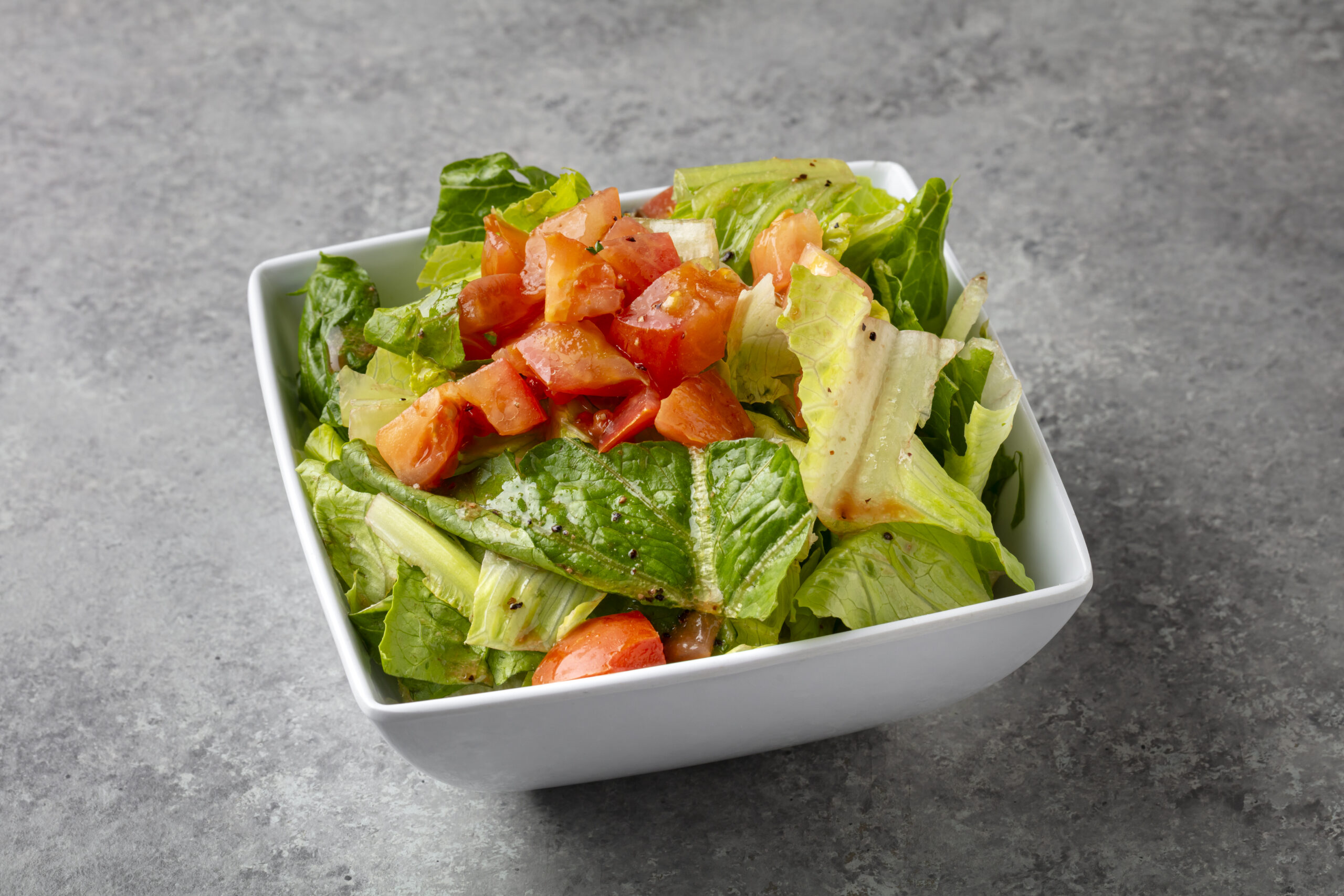 A vegetarian mix of romaine heart, tomatoes, cucumbers, red onions, and red bell peppers, tossed with fresh squeezed lemon juice and extra virgin olive oil, topped with feta cheese and Greek olives.