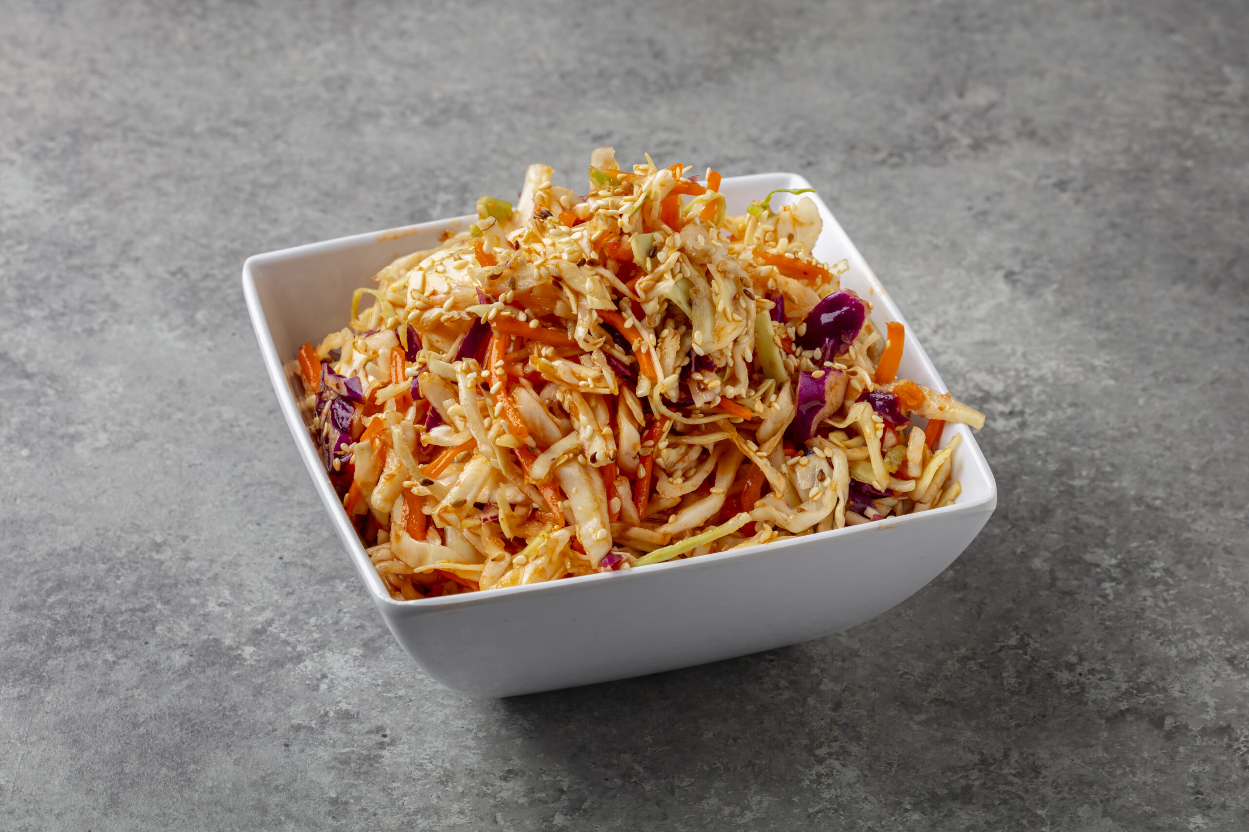 Romaine heart, chicken, mixed shredded cabbage and carrots, green onions, cucumbers, and pita croutons, tossed with Maisón Chinese dressing topped with mandarin oranges and sprinkle of sesame.
