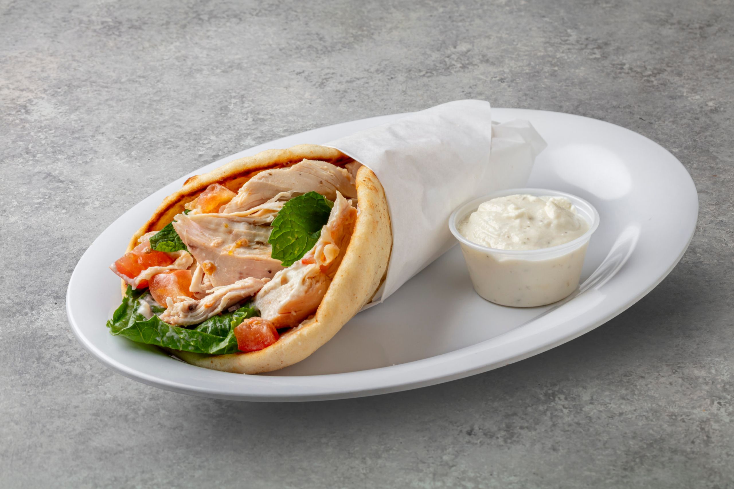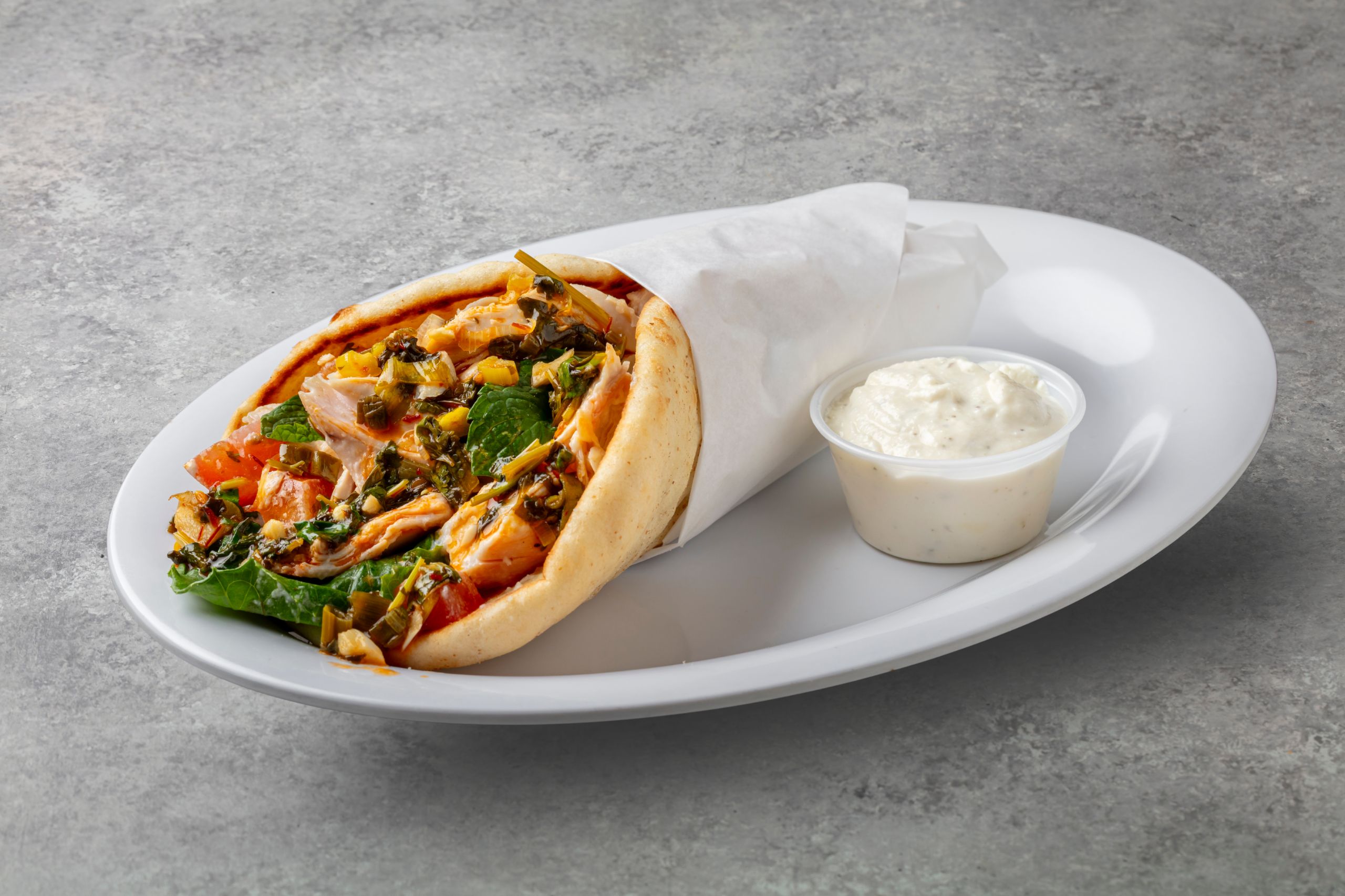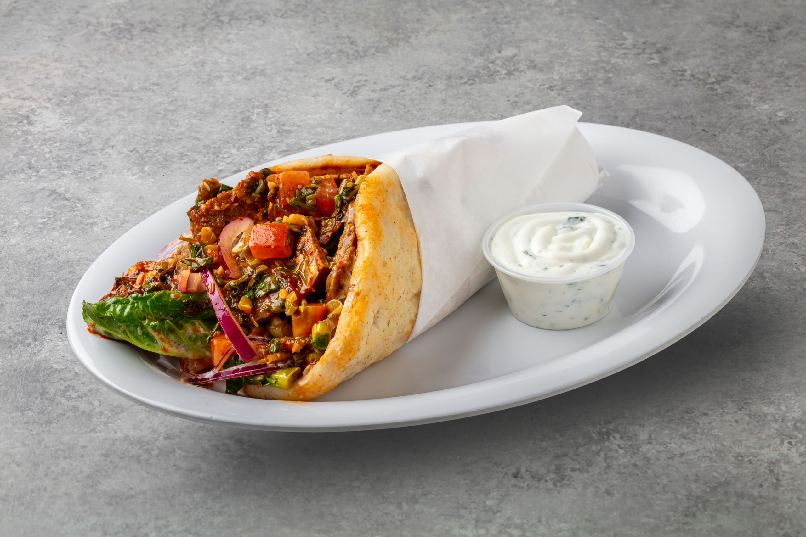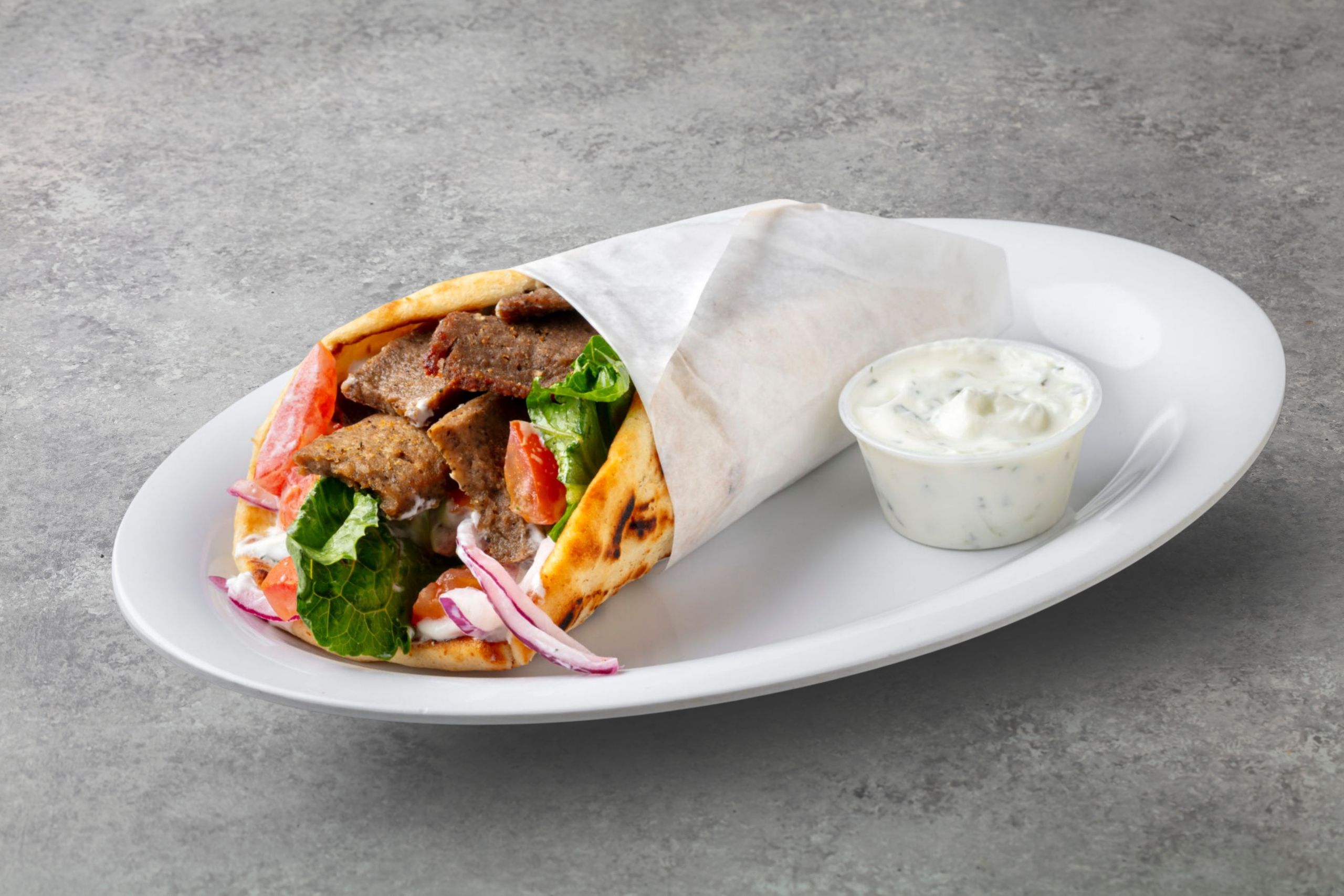 Tender and juicy gyro cooked in our spicy garlic sauce, topped with lettuce, tomatoes, onions and tzatziki sauce, all wrapped in a warm flatbread.