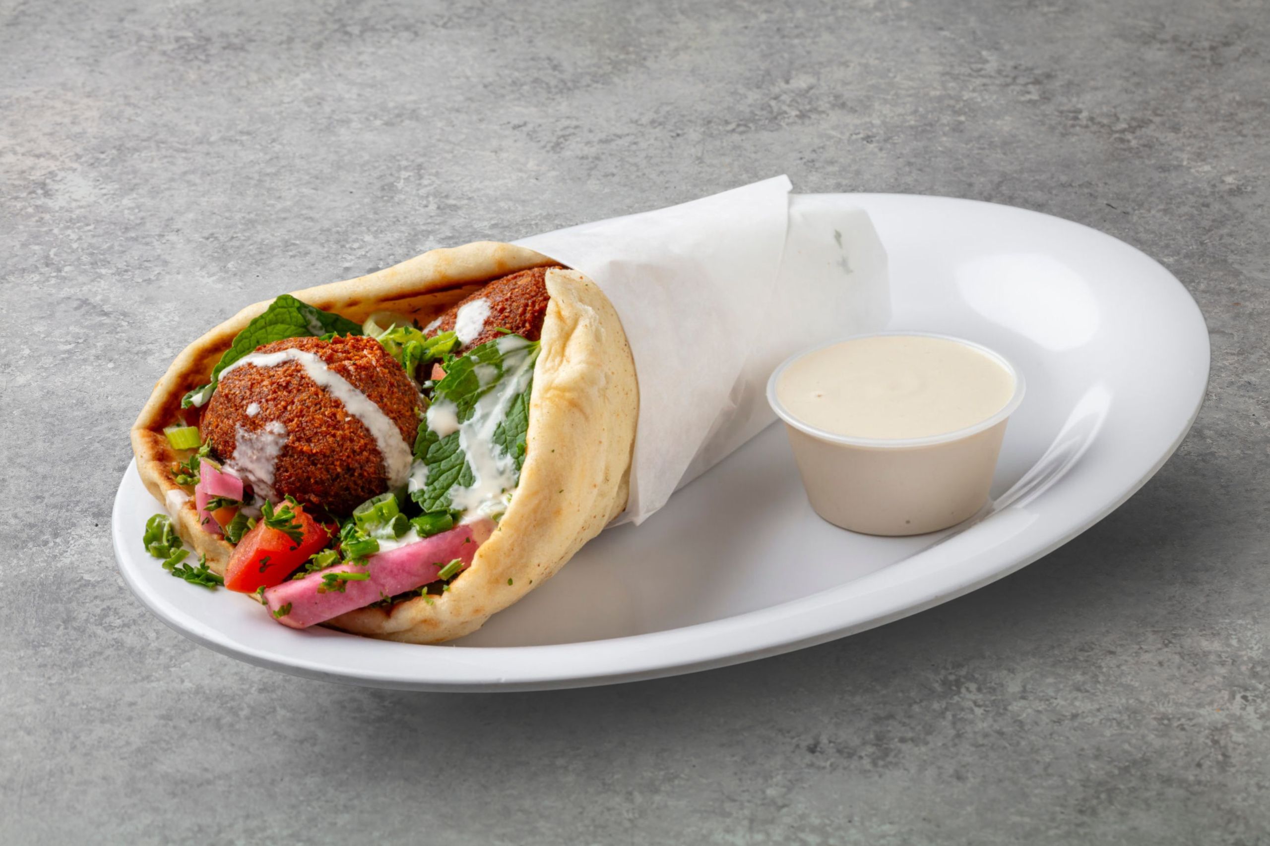 Three golden brown savory falafels, parsley, green onions, tomatoes, and pickled turnips, drizzled with tahini sauce, all wrapped in a warm flatbread.