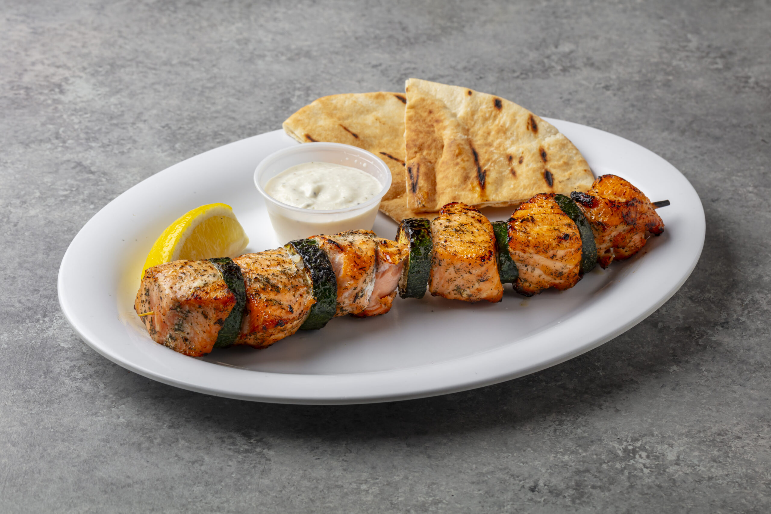 Grilled Salmon fillet on a bed of rice with your choice of two sides, pita bread and garlic sauce.