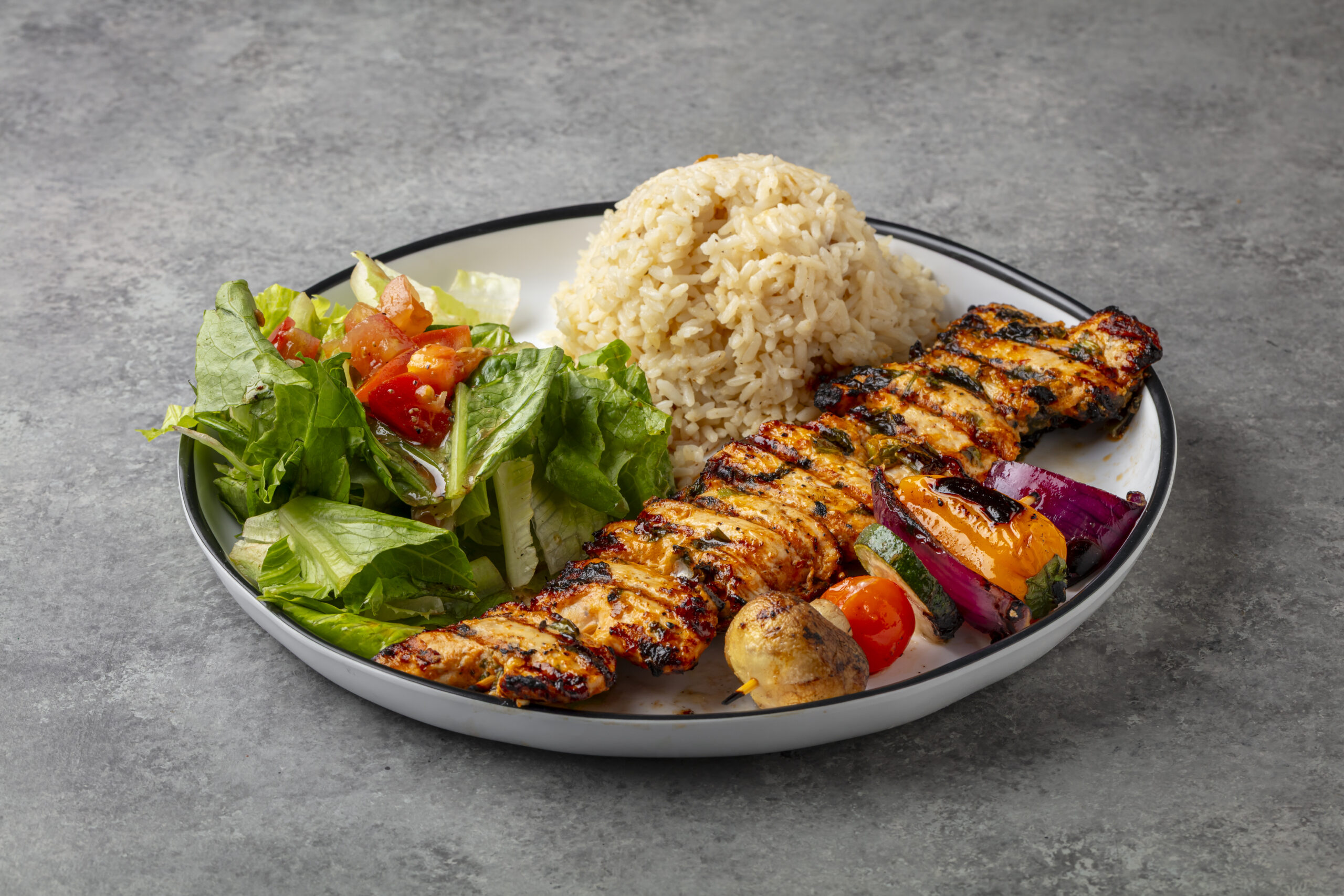 Enjoy a skewer of grilled chicken kabob with our Caesar salad.