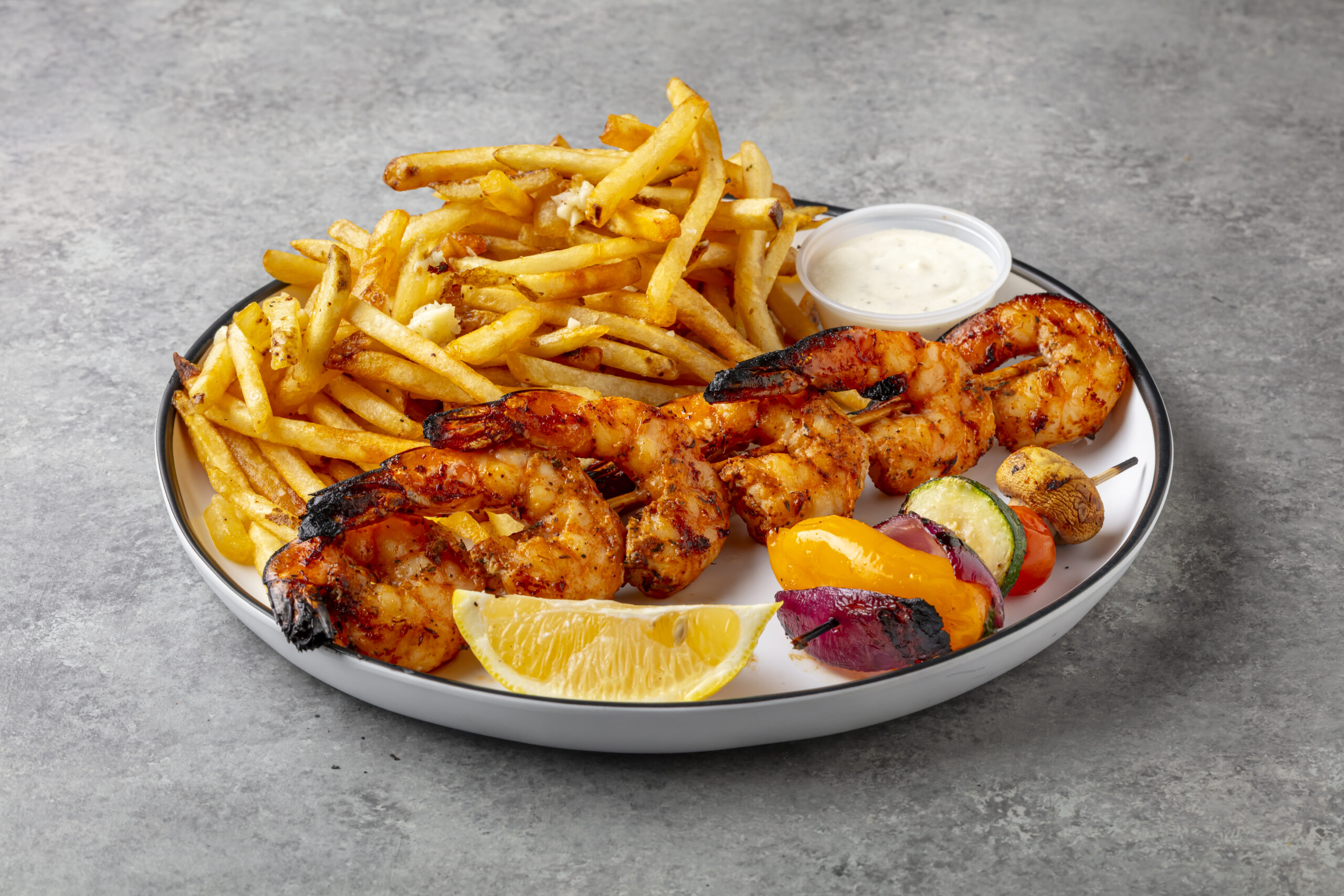 6 Large Tiger Shrimp on a skewer grilled to perfection with your choice of 2 sides.