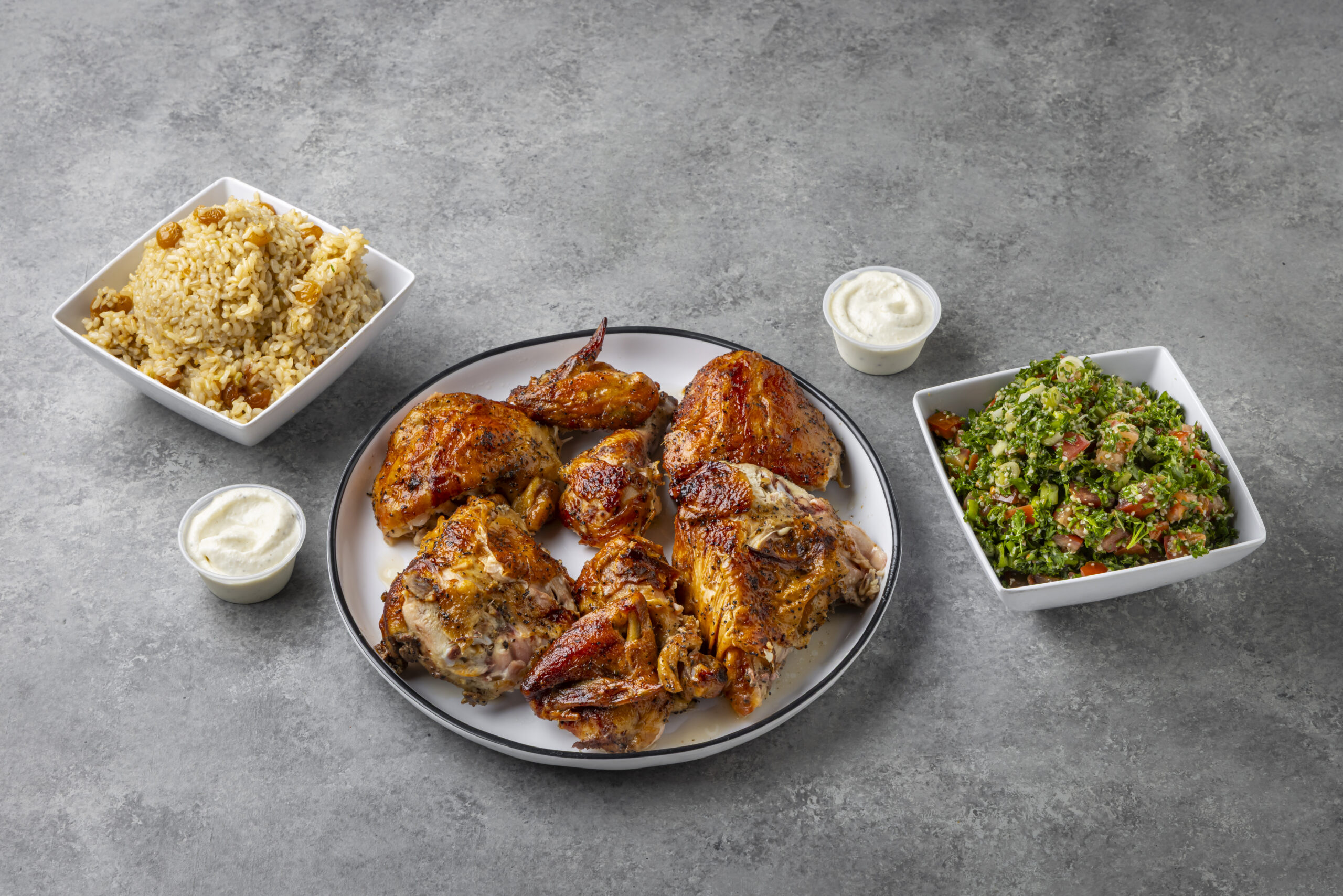 Naturally Fed, Hormone-Free Rotisserie Chicken. All Served with Pita Bread and Garlic Sauce.